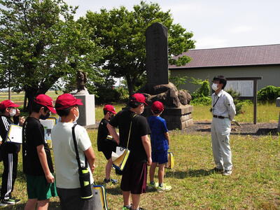 つがる市郷土学の学習。つがる市の偉人国際的天文学者、故一戸直蔵博士の足跡を訪ねています(^^)