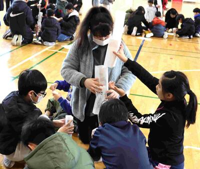 梵珠少年自然の家の先生に来ていただき、低学年を対象に雪となかよし集会を行いました。