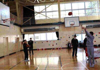 6年生全員でフリースローが8本決まるか、〇×クイズをしたり