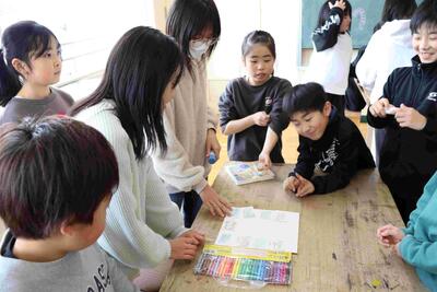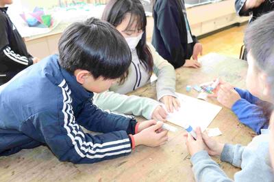 今日の業間は、縦割り班毎に6年生に贈る色紙づくりをしました。