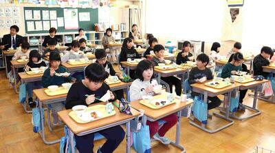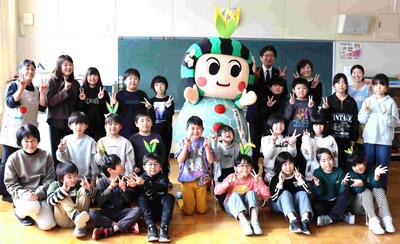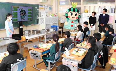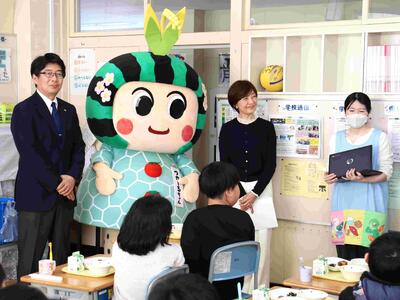 今日は、新メニューのお披露目ということで、料理家の先生と教育長さん、そして、つがーるちゃんも来校し、3年生の子ども達と共に給食の時間を過ごしました。