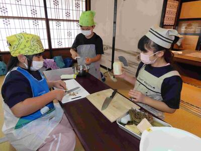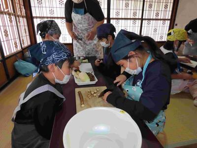 4年生が、総合的な学習の時間として「地域の方々から学ぼう」をテーマに、「古民家風丸」を訪れ、郷土料理「けの汁」づくりを体験しました。