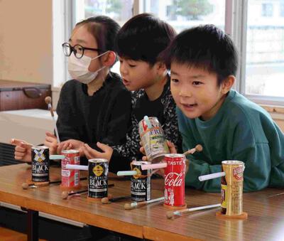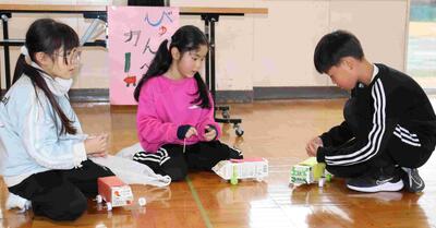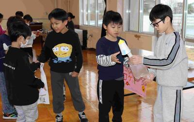 3校時、2年生主催のおもちゃフェスティバルが行われました。招待されたのは1年生。2年生が、生活科の学習で作った手作りおもちゃの遊び方を1年生に丁寧に説明していました。1年生は、2年生の説明をしっかり聞いて、楽しそうに遊んでいました。活動をとおして、身近にあるものに触れ、できる遊びがあることや、それぞれの素材のもつ面白さや不思議さ気付いていました。